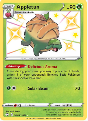 Carta: Appletun es una carta de Pokémon de la expansión Shining Fates: Shiny Vault (SHFSV). Este Pokémon tipo Dragón/Planta es conocido por su aspecto dulce y su habilidad única para producir néctar especial.