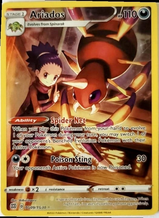 Edición: SWSH09: Brilliant Stars, una carta que presenta a Ariados con un enfoque estratégico, destacando su peligrosidad y su rol en las batallas.