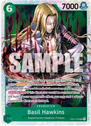 Personaje: Basil Hawkins - 500 Years in the Future (OP07) muestra a Basil Hawkins, uno de los personajes de la saga de One Piece conocido por ser un capitán pirata y usuario de la fruta del diablo Witch-Witch no Mi que le otorga habilidades vudú. Hawkins es calculador, meticuloso y conocido por sus habilidades en la estrategia de combate, siendo un miembro de los piratas de Kaido. Su habilidad de predecir el futuro a través de las cartas le ha dado un aire misterioso y le ha permitido sobrevivir a diversas situaciones.