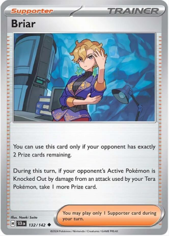 Carta: Briar - 132/142 es una carta de Pokémon que pertenece a la expansión SV07: Stellar Crown (SV07). Briar es un personaje clave en la historia de la expansión, y la carta ofrece una habilidad o efecto estratégico que impacta la dinámica del juego, como el control de energías o la manipulación de los recursos del oponente.
