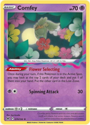 Carta: Comfey es una carta de Pokémon que pertenece a la expansión SWSH11: Lost Origin (SWSH11). Comfey es un Pokémon de tipo Hada con habilidades que pueden ayudar a recuperar energías y apoyar otras cartas en el campo, destacándose por su habilidad Flower Gathering, que le permite buscar cartas de energía en el mazo.