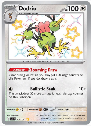 Edición: SV: Paldean Fates (PAF), una expansión que presenta a Dodrio con una carta que destaca su agilidad y versatilidad en combate, proporcionando a los jugadores nuevas estrategias para sorprender a sus oponentes con su velocidad y ataques poderosos.