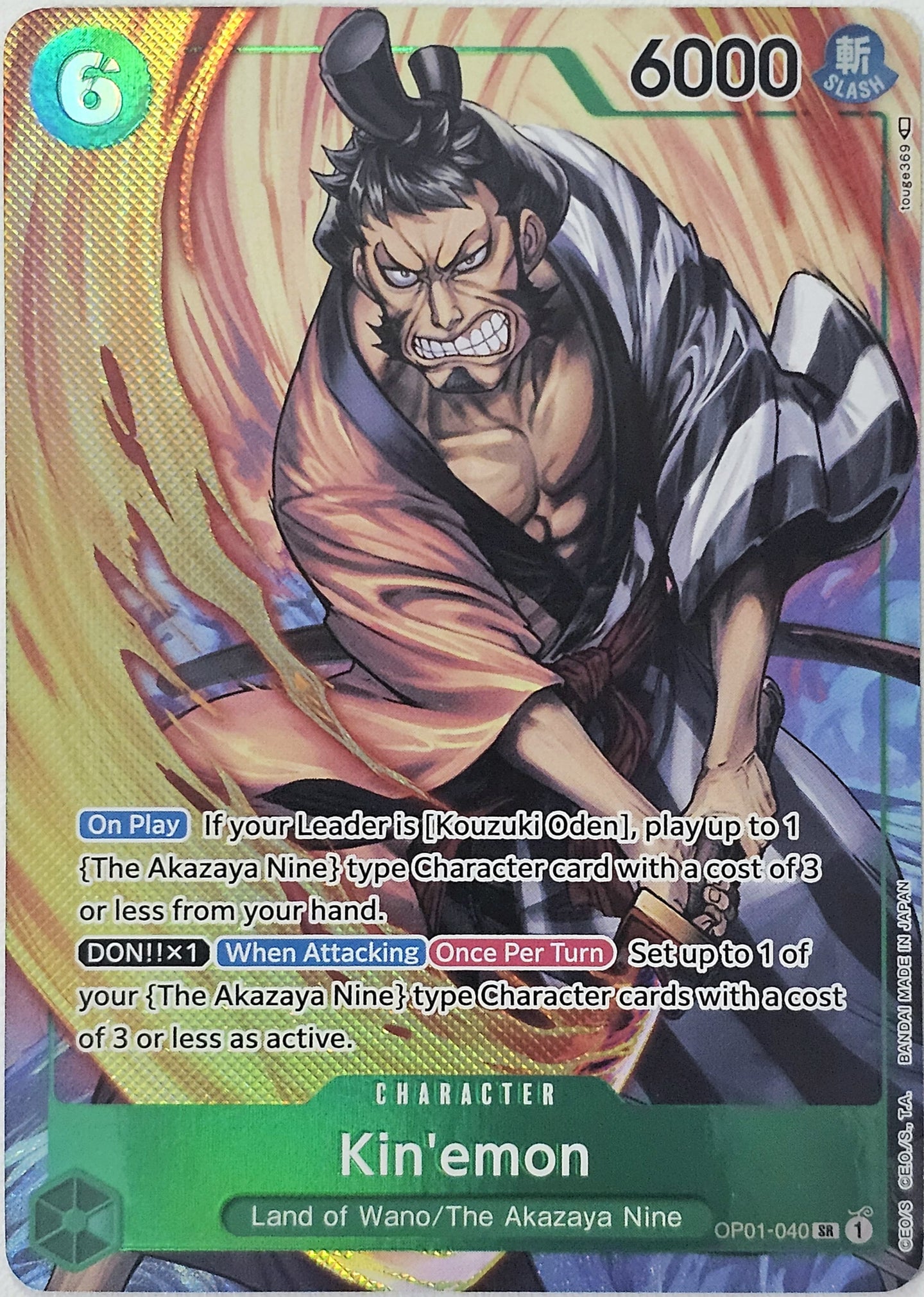 Arte: La carta muestra a Kin'emon en una pose dinámica, destacando su habilidad con la espada y su determinación para proteger a sus aliados. Es una ilustración que resalta su rol como un guerrero noble.