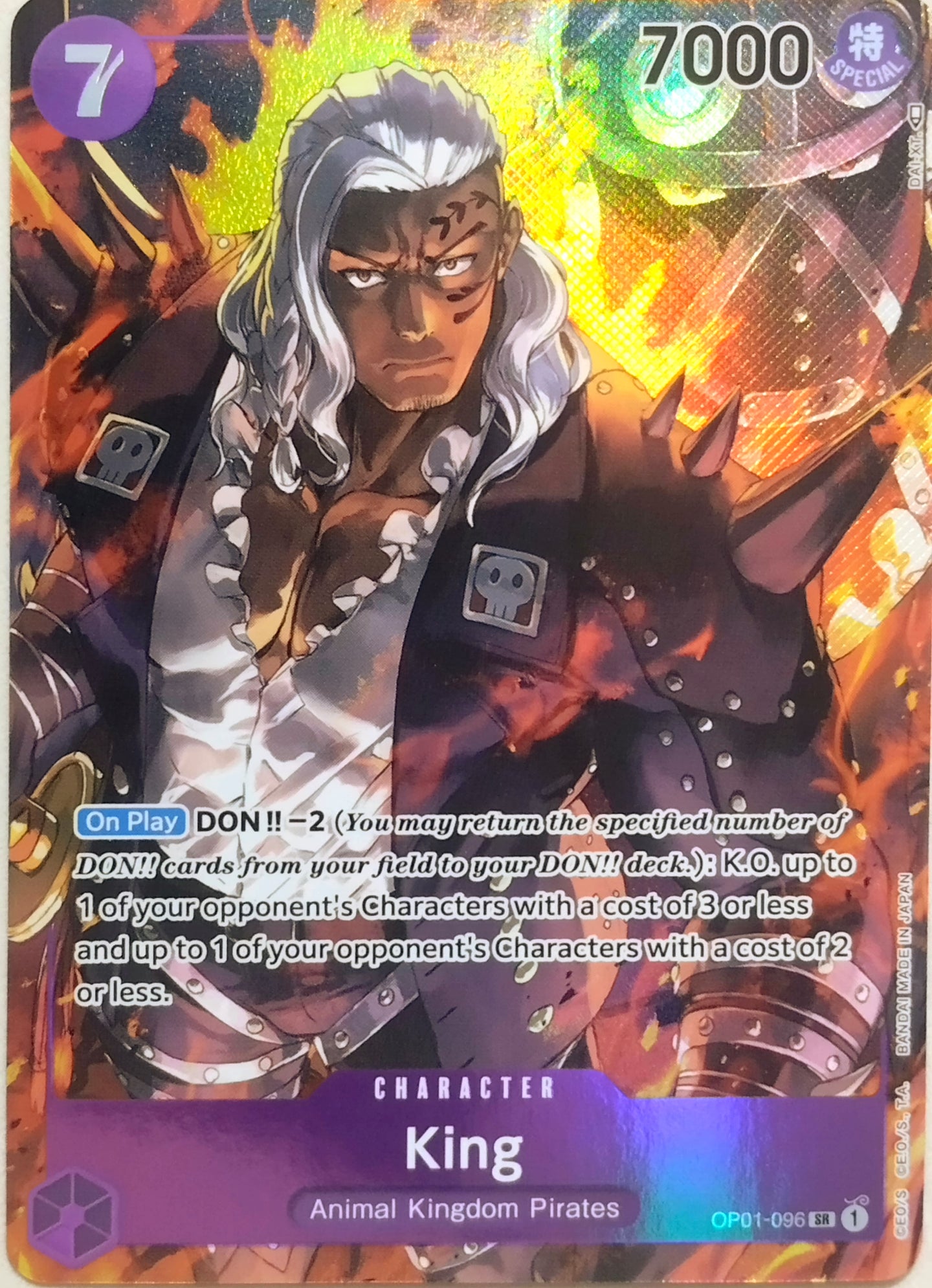 - Personaje: King, también conocido como "King el Incendio," es uno de los tres All-Stars de los Piratas de las Bestias y el segundo al mando de Kaido. Como miembro de la raza Lunaria, posee habilidades excepcionales, como la resistencia al fuego y la capacidad de generar llamas, lo que lo convierte en un oponente temible en el combate.