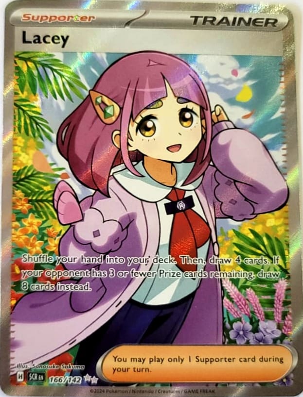 Edición: SV07, una carta especial numerada como 166/142, que presenta a Lacey en una versión destacada dentro de esta expansión.