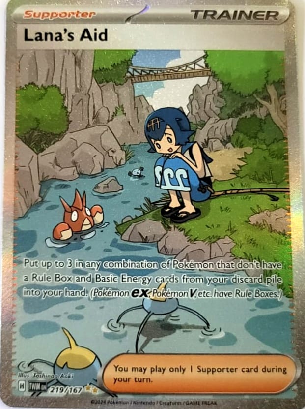 Personaje: Lana's Aid es una carta de entrenador que representa la ayuda y el apoyo de Lana, una de las líderes de gimnasio de la región de Alola. Con una actitud amable y compasiva, Lana ofrece su asistencia para ayudar a los entrenadores a fortalecer su conexión con sus Pokémon de agua, brindando un respiro en medio de los combates y ofreciendo estrategias centradas en el trabajo en equipo.