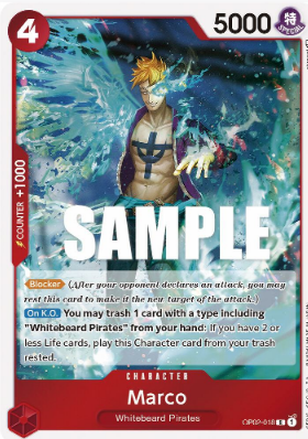 Carta: Marco es una carta de One Piece de la expansión Paramount War (OP02). Representa a Marco, el médico y primer comandante de los Piratas de Barbablanca, conocido por su habilidad para transformarse en un fénix gracias a su Tori Tori no Mi, Modelo: Fénix.