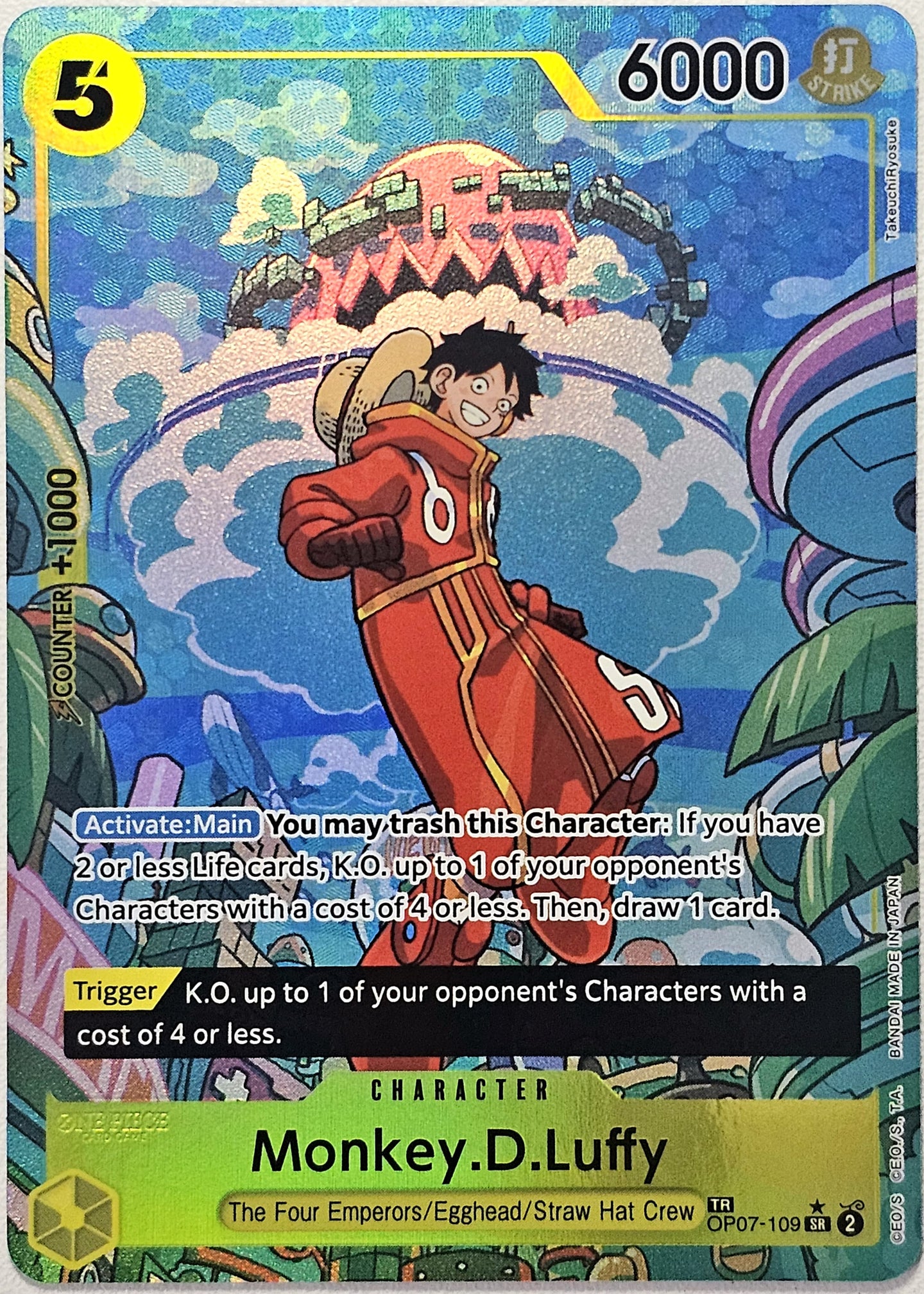 Arte: La ilustración de esta carta muestra a Luffy en una de sus poses icónicas, capturando su energía vibrante y su determinación. El arte destaca su expresión desafiante y su postura heroica, con detalles que enfatizan su carácter y su rol central en la serie. El fondo puede incorporar elementos representativos de su viaje o de sus compañeros de tripulación, añadiendo a la atmósfera épica de la carta.