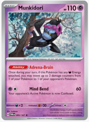 Carta: Munkidori es una carta de Pokémon de la expansión SV06: Twilight Masquerade (TWM). Munkidori es un Pokémon de tipo Psíquico y Lucha, conocido por su habilidad para equilibrar poderes mentales y físicos, lo que le permite ejecutar ataques rápidos y certeros mientras mantiene una estrategia calculada.