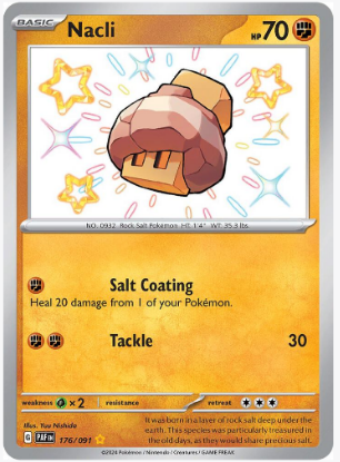 Carta: Nacli es una carta de Pokémon de la expansión SV: Paldean Fates (PAF). Este Pokémon de tipo Roca tiene una apariencia sólida y resistente, reflejando su capacidad para soportar los embates del tiempo y el entorno.