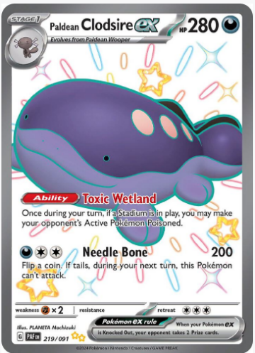 Arte: La carta muestra a Paldean Clodsire ex en una pose fuerte, con detalles que reflejan su resistencia y su naturaleza robusta. Su cuerpo grande y sólido es destacado, mientras que el fondo resalta un entorno que refleja su conexión con el terreno y la naturaleza. La imagen captura la sensación de poder y solidez que caracteriza a este Pokémon.
