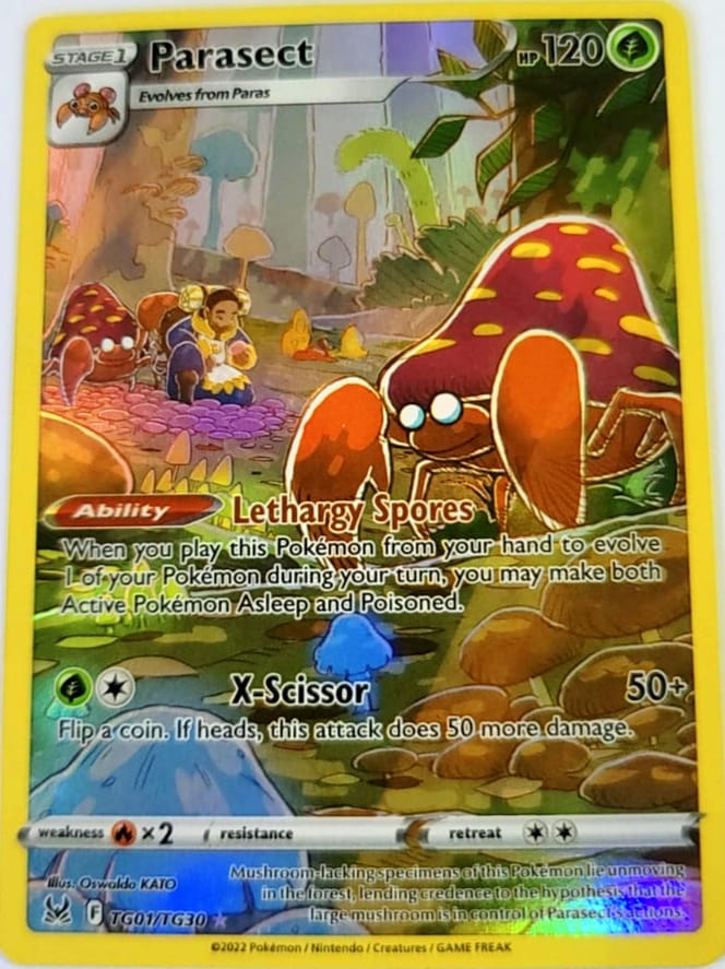 Edición: SWSH11: Lost Origin, una carta que presenta a Parasect con un diseño único que resalta su relación con el ecosistema y sus habilidades estratégicas.