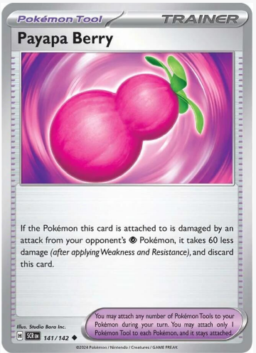 Carta: Payapa Berry es una carta de objeto de la expansión SV07: Stellar Crown (SV07). Proporciona soporte defensivo al reducir el daño recibido de ataques de Pokémon específicos, ofreciendo utilidad estratégica en situaciones clave.