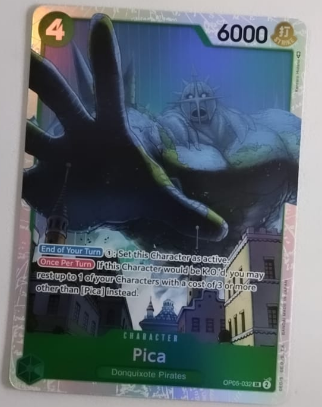 Edición: Esta carta pertenece a la expansión Awakening of the New Era (OP05), que recoge elementos y personajes clave de la saga que narra la lucha en Dressrosa, donde Pica juega un papel crucial como uno de los principales antagonistas.