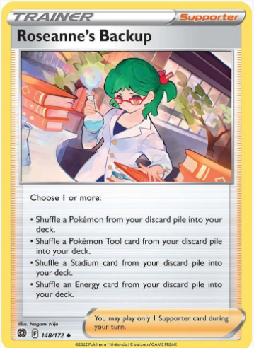 Carta: Roseanne's Backup es una carta de partidario de la expansión SWSH09: Brilliant Stars (SWSH09). Esta carta permite recuperar múltiples recursos del descarte, ofreciendo una versatilidad estratégica en el juego competitivo.