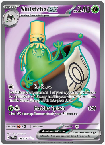 Carta: Sinistcha ex es una carta de la expansión SV06: Twilight Masquerade (TWM). Sinistcha, un Pokémon de tipo Fantasma, es conocido por su comportamiento misterioso y su conexión con la oscuridad. En su forma ex, muestra un poder impresionante que lo convierte en una carta codiciada.