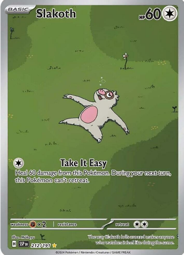 Edición: SV08: Surging Sparks presenta a Slakoth como una carta que refleja su actitud relajada y su carácter único. Esta edición captura la tranquilidad de Slakoth mientras destaca su potencial oculto.