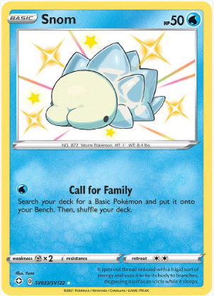 Carta: Snom es una carta de Pokémon de la expansión Shining Fates: Shiny Vault (SHFSV). Esta carta presenta a Snom en su forma shiny, con un diseño brillante que resalta en la colección. Snom es un Pokémon de tipo Hielo/Insecto conocido por su apariencia adorable y su lento pero seguro avance sobre superficies frías.