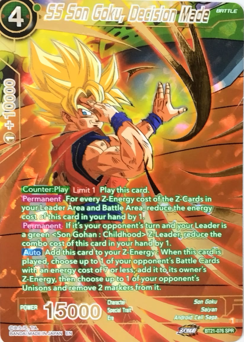 Personaje: SS Son Goku, Decision Made captura a Goku en su forma Super Saiyan, simbolizando un momento crucial en su viaje como protector del universo. En esta representación, Goku encarna determinación, fortaleza, y una inquebrantable voluntad para superar desafíos, uniendo estrategia y poder para enfrentar a los enemigos más formidables.