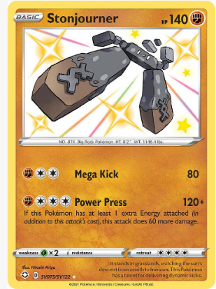Arte: La carta muestra a Stonjourner con su figura imponente y su brillo característico de shiny, con detalles visuales que enfatizan su tipo roca y su tamaño colosal, ambientado en un paisaje sencillo pero efectivo.