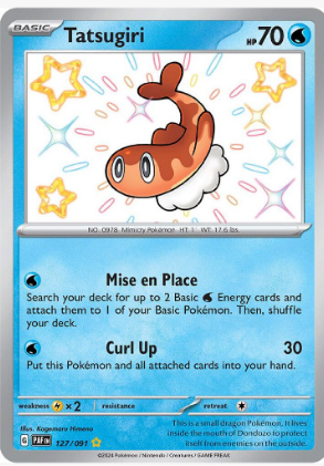 Arte: La carta muestra a Tatsugiri en una pose distintiva, resaltando su aspecto fluido y su habilidad para adaptarse a diferentes corrientes de agua. El arte refleja su naturaleza acuática, con detalles que subrayan su diseño llamativo y sus características de velocidad y flexibilidad.