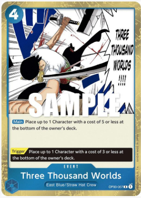 Carta: Three Thousand Worlds es una carta de One Piece de la expansión Pillars of Strength (OP03). Esta carta representa una habilidad o ataque impresionante que puede alterar el curso de la batalla, evocando una poderosa muestra de control y dominio sobre el campo de juego.