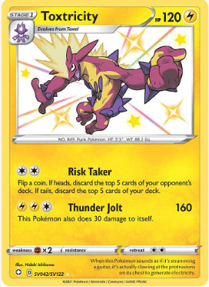 Carta: Toxtricity es una carta de Pokémon de la expansión Shining Fates: Shiny Vault (SHFSV). Este Pokémon de tipo Eléctrico/Veneno es conocido por su actitud audaz y su capacidad para generar poderosas descargas eléctricas.
