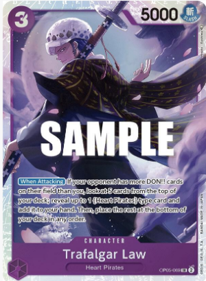Edición: Esta carta pertenece a la expansión Awakening of the New Era (OP05), que captura la esencia de personajes cruciales como Law, en medio de las luchas por el poder y el enfrentamiento con figuras de autoridad en el mundo de One Piece. Esta serie subraya el crecimiento de los protagonistas y sus contribuciones decisivas en los eventos del mundo.