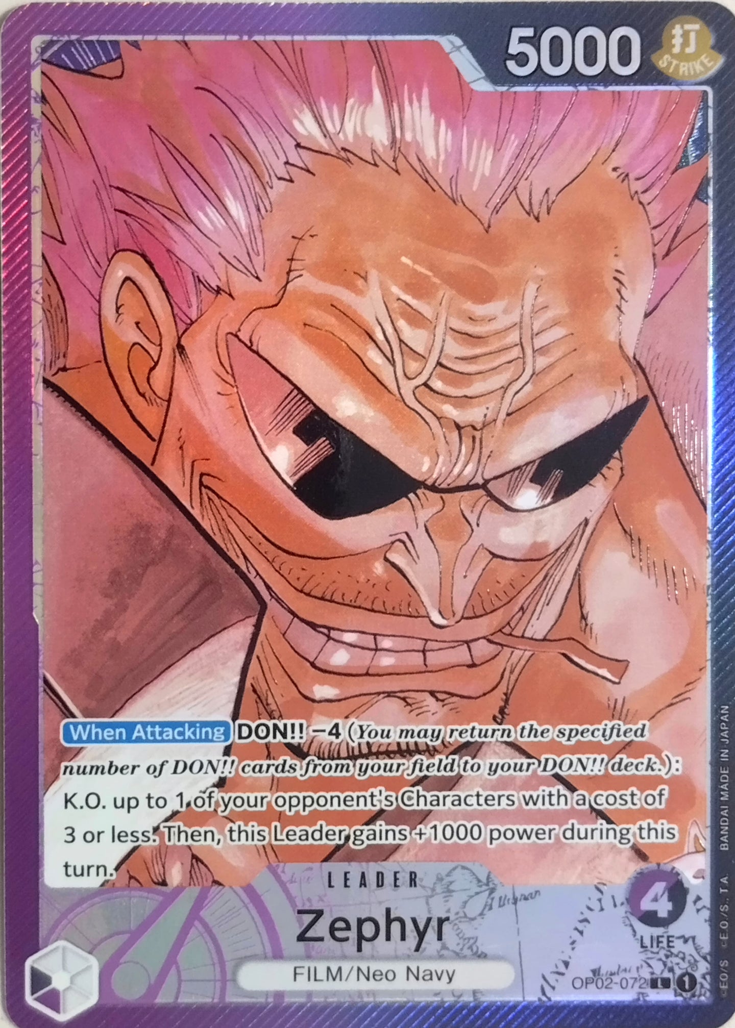 - Edición: Paramount War (OP02) incluye personajes que definieron los mayores conflictos de One Piece. Esta edición Alternate Art presenta a Zephyr con un diseño que resalta su impacto y complejidad.